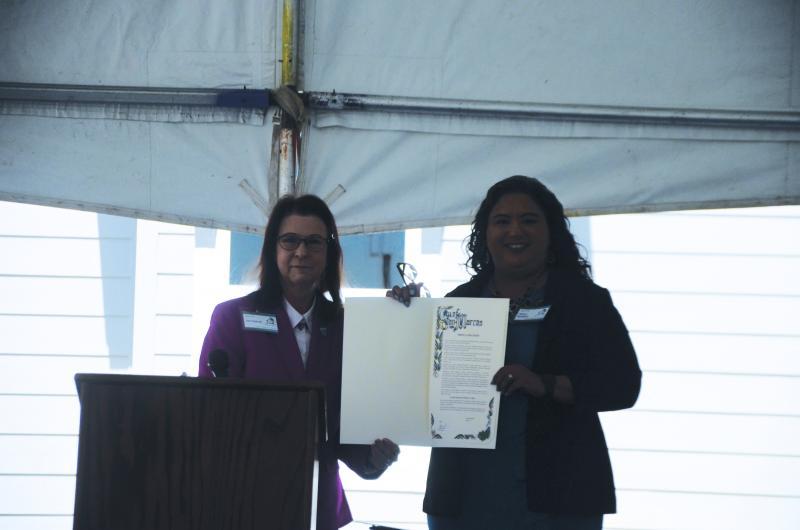 San Marcos Mayor Jane Hughson presents a proclamation to Hays-Caldwell Women’s Center Executive Director Melissa Rodriguez, celebrating HCWC’s grand opening of its Marla R. Johnson Family Housing Center on Friday.