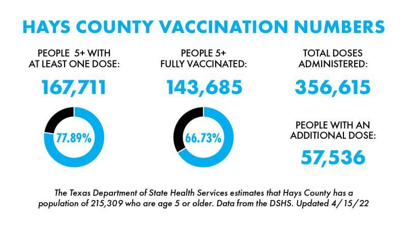 According to the DSHS, 143,685 county residents are considered fully vaccinated — 66.73% of 215,309 eligible residents who are 5 years or older as of Thursday. The DSHS stated that 167,711 Hays County residents have received at least one COVID-19 vaccination dose — 77.89% of eligible residents. Additionally, the DSHS stated that 57,536 Hays County citizens have received an additional vaccine dose as of Thursday.