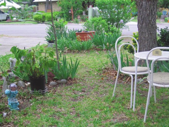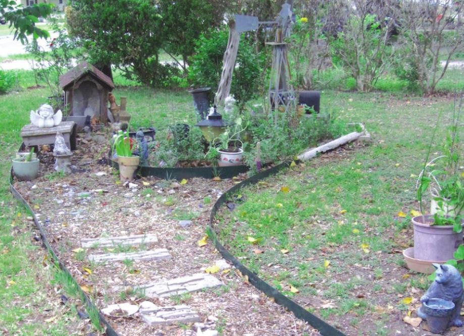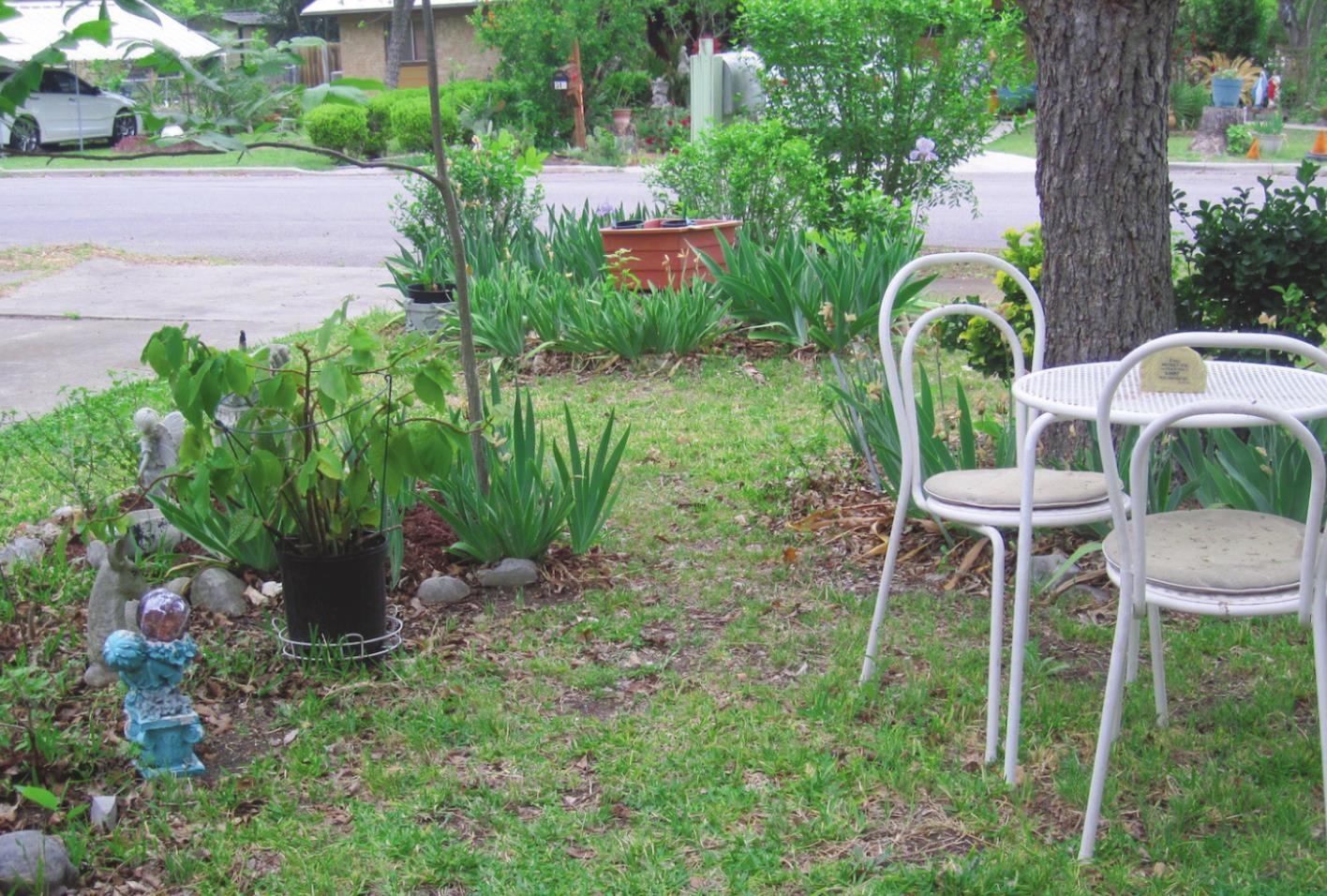 The front yard has developed into several “mini gardens” in separate planting beds surrounded by turf grass and partially shaded by two pecan trees planted when the family moved into their home in the 1970s. Two young pecan trees are already planted to take the place of these older trees nearing the end of their lifespan. The old trees shade a small metal table and chairs, which welcome garden visitors and where Hope can enjoy morning coffee. Near this outdoor seating, a metal-edged gravel path leads to a small covered structure housing an image of the Virgin of Guadalupe, a gift from one of Hope’s brothers. At the end of the path, another mini garden includes red and white sages and potted cacti, and offers still another setting for garden ornaments.