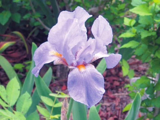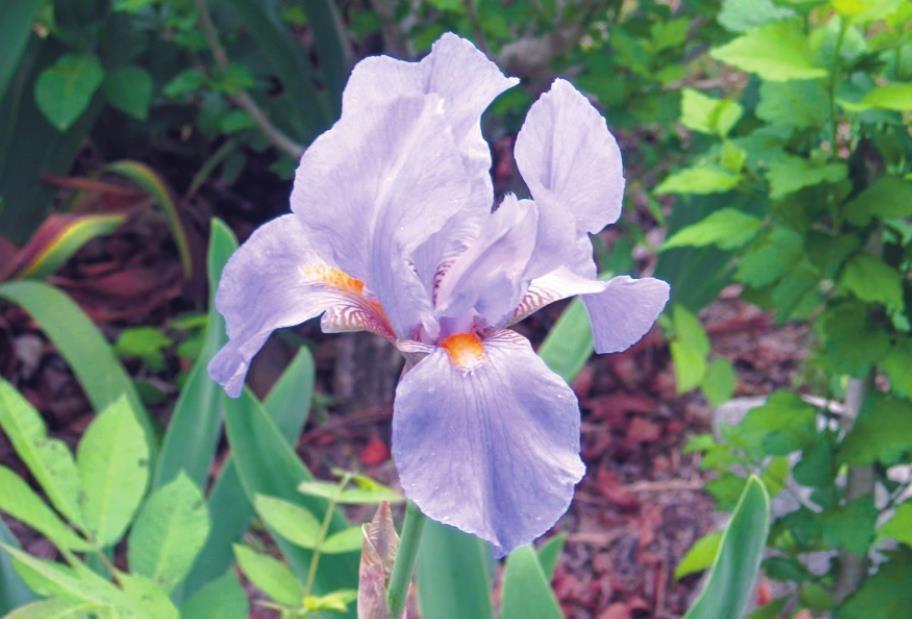 Irises, blooming purple, yellow and white, make their home in most of the planting beds, with an unusual black/purple iris in a bed next to the house near the red amaryllis and a single lily plant. Roses in a variety of colors mix with the irises and other bedding plants in each mini garden. One mature bush next to the house is over 40 years old and still produces large pink blossoms. Other roses in the front yard are pale pink, vibrant yellow and red. Hope notes that the althea (Rose of Sharon) shrubs beside the mailbox offer two types of flowers: one a light pink double bloom, the other an almost transparent single lavender blossom.
