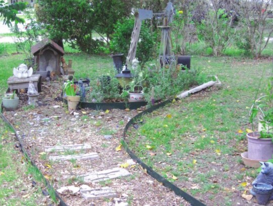 Older gardens often feature a great variety of plants, and Hope’s front yard includes plants and garden art from her aunts, her mother (two althea bushes by the mailbox), and even her grandmother (three amaryllis near the house). Daughter Michelle also contributed to the family plant legacy with pink-flowered angel wings in a front corner bed around a tree stump near the street, where a new mimosa tree now claims residence. Some plants came from friends and colleagues at CTMC, where Hope worked for 34 years, beginning when it was Hays Memorial Hospital and later moved to its present location in 1983, changing its ownership and name.