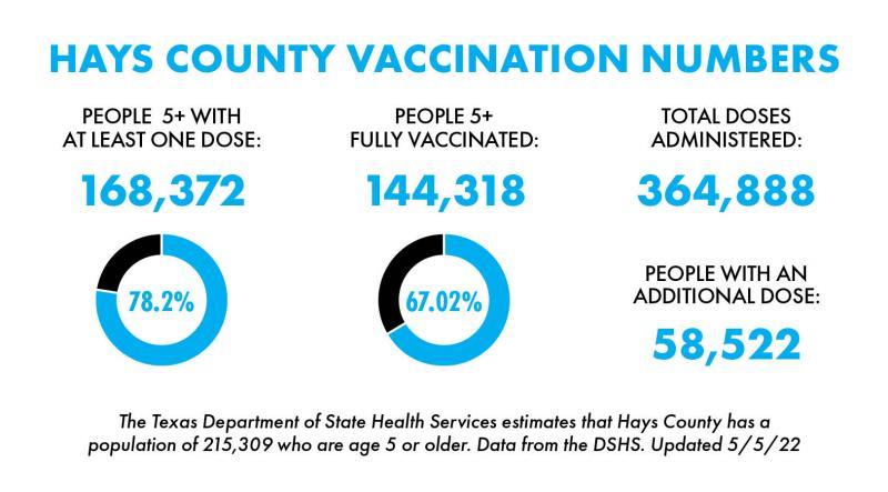 According to the DSHS, 144,318 county residents are considered fully vaccinated — 67.02% of 215,309 eligible residents who are 5 years or older as of Thursday. The DSHS stated that 168,372 Hays County residents have received at least one COVID-19 vaccination dose — 78.2% of eligible residents. Additionally, the DSHS stated that 58,522 Hays County citizens have received at least one additional vaccine dose as of Thursday.