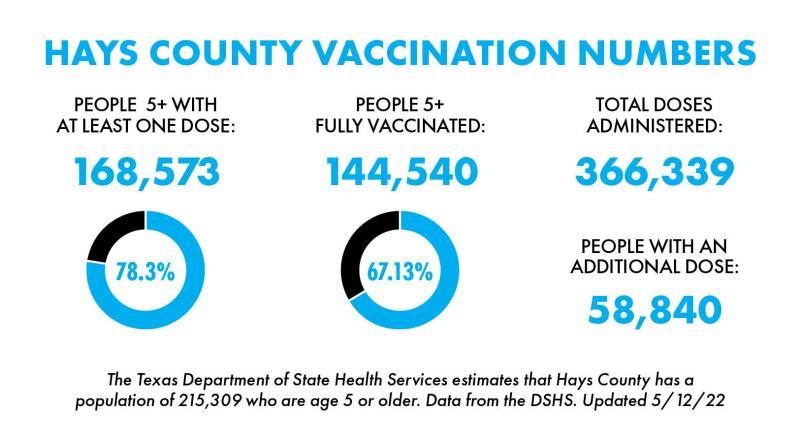 According to the DSHS, 144,540 county residents are considered fully vaccinated — 67.13% of 215,309 eligible residents who are 5 years or older as of Thursday. The DSHS stated that 168,573 Hays County residents have received at least one COVID-19 vaccination dose — 78.3% of eligible residents. Additionally, the DSHS stated that 58,840 Hays County citizens have received at least one additional vaccine dose as of Thursday.