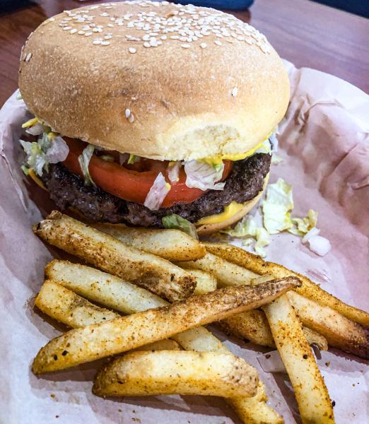There’s also the BBQ bacon burger ($8) — served with mustard, lettuce, tomatoes, pickles, grilled onions, American cheese.