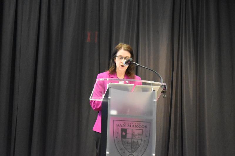 Above, San Marcos Mayor Jane Hughson speaks to a crowd during SMTX 2022— a citywide update at the San Marcos Activity Center on Tuesday.