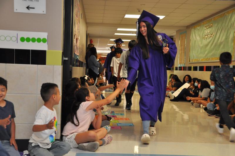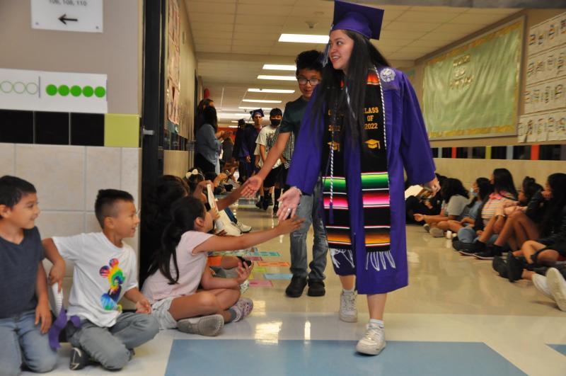San Marcos High School graduates visited the elementary school halls they once walked for the annual grad walk on Thursday. Pictured, SMHS seniors who attended Mendez Elementary high-five students as they were cheered for their accomplishments.