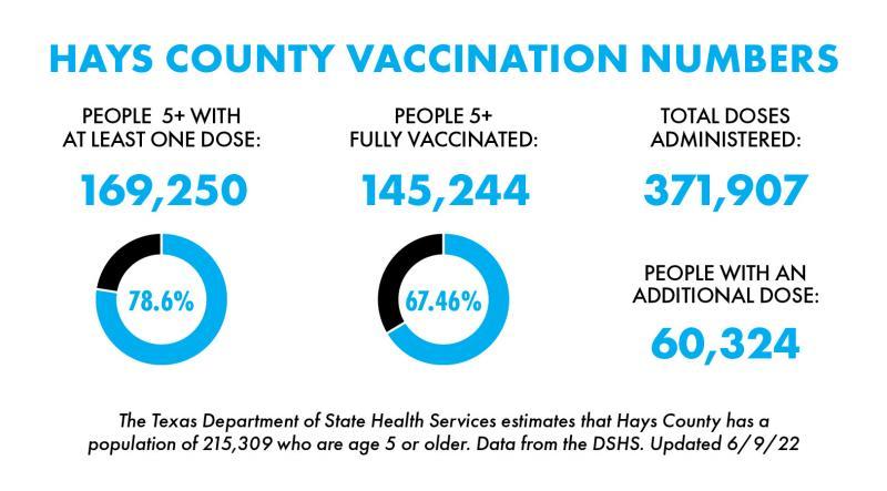 According to the DSHS, 145,244 county residents are considered fully vaccinated — 67.46% of 215,309 eligible residents who are 5 years or older as of Thursday. The DSHS stated that 169.250 Hays County residents have received at least one COVID-19 vaccination dose — 78.6% of eligible residents. Additionally, the DSHS stated that 60,342 Hays County citizens have received at least one additional vaccine dose as of Thursday.