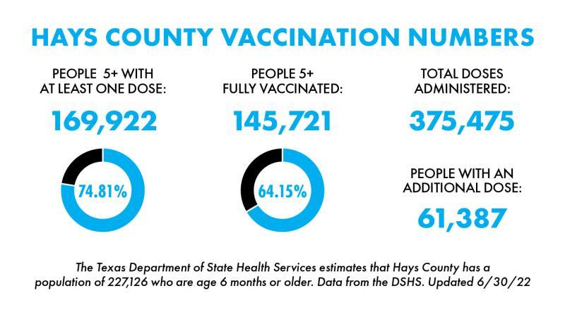 According to the DSHS, 145,244 county residents are considered fully vaccinated — 67.46% of 215,309 eligible residents who are 5 years or older as of Thursday. The DSHS stated that 169.250 Hays County residents have received at least one COVID-19 vaccination dose — 78.6% of eligible residents. Additionally, the DSHS stated that 60,342 Hays County citizens have received at least one additional vaccine dose as of Thursday.