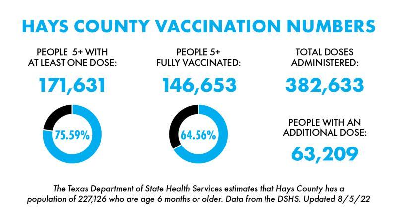 According to the DSHS, 146,653 county residents are considered fully vaccinated — 64.56% of 227,126 eligible residents who are 6 months of age or older as of Friday. The DSHS stated that 171,631 Hays County residents have received at least one COVID-19 vaccination dose — 75.59% of eligible residents. Additionally, the DSHS stated that 63,209 Hays County citizens have received at least one additional vaccine dose as of Friday.