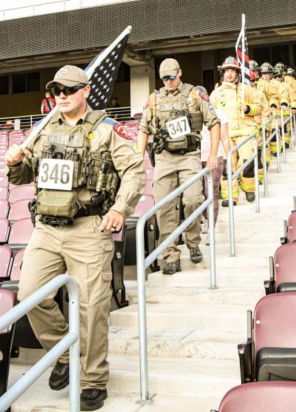 Above, local law enforcement climbs the stairs at Bobcat Stadium.