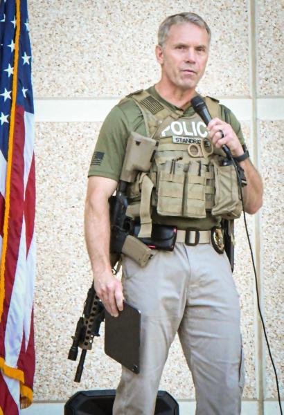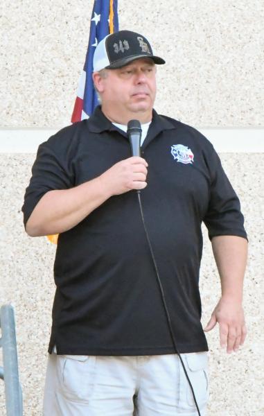 Above, San Marcos Chief of Police Stan Standridge speaks at Sunday’s stair climb.
