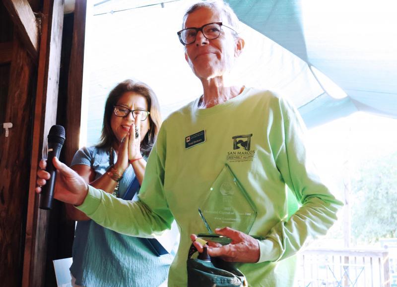 Above, Greenbelt Alliance trail crew leader Todd Derkacz beams as he holds his River Guardianship Award, given to him by the Mermaid Society SMTX for his work designing the city's greenspace trails. Daily Record photo by Zoe Gottlieb