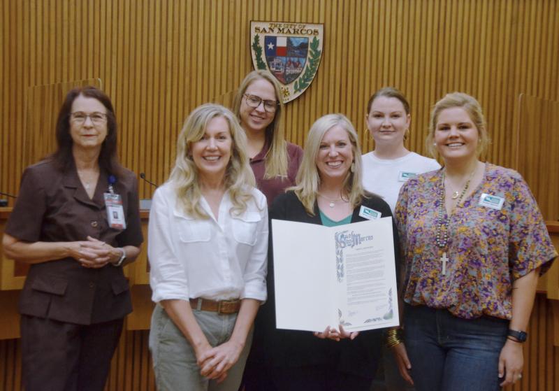 Above, members of the Hays County Food Bank accept a proclamation for Hunger Action Month. Pictured, front row from left to right: Kristin Wright, Jamie Lee Case and Eleanor Owens. Back row, from left to right: Hughson, Jessica Ramos and Iris Tate. Daily Record photo by Nick Castillo