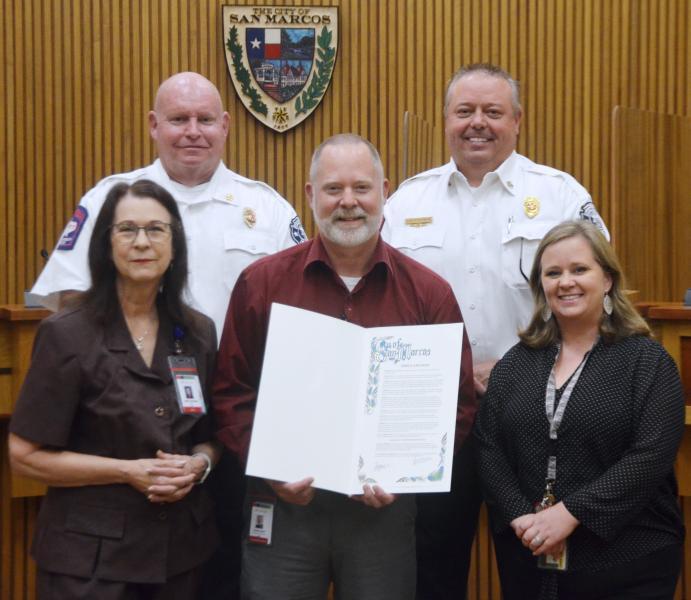 Above, 9/11 Remembrance Day is honored with a proclamation. Pictured, front row from left to right: San Marcos Fire Chief Les Stephens, Kimberly Cisneros and Director of Public Safety Chase Stapp. Back row from left to right, Hughson and Jim Matano. Daily Record photo by Nick Castillo