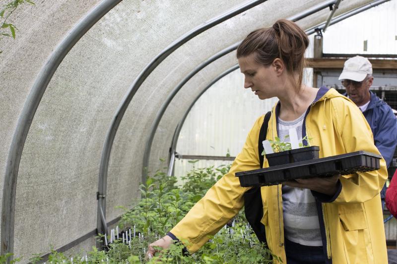 In the greenhouse, Holly Veselka sorts through Walker's Low Catmint plants as she selects new additions for her growing butterfly garden at the Sustainability Fair & Native Plant Sale at the Discovery Center.