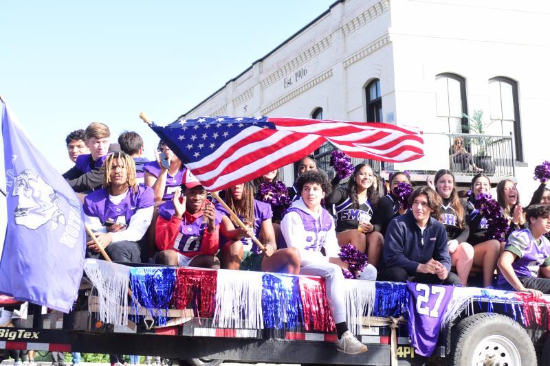 Above, San Marcos High School cheerleaders and the football team participate in the parade.