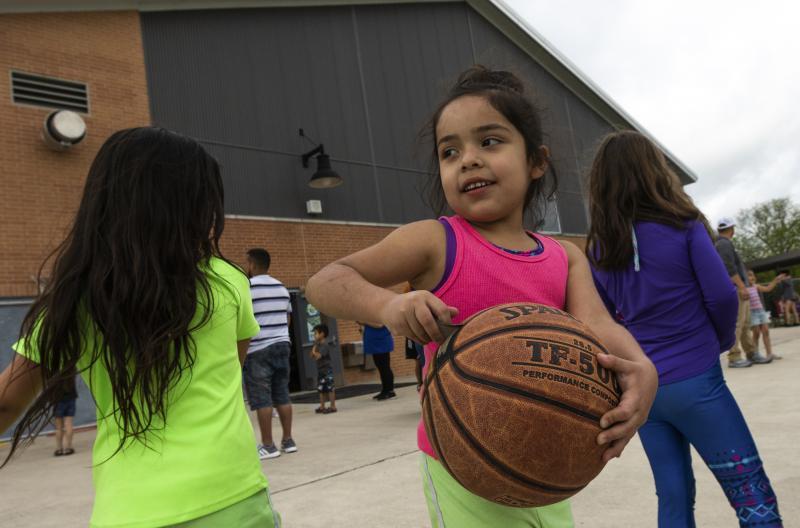 At one of the game stations, Sophie Solis Zapata gets ready to take her shot at knocking down the most bowling pins using a basketball.