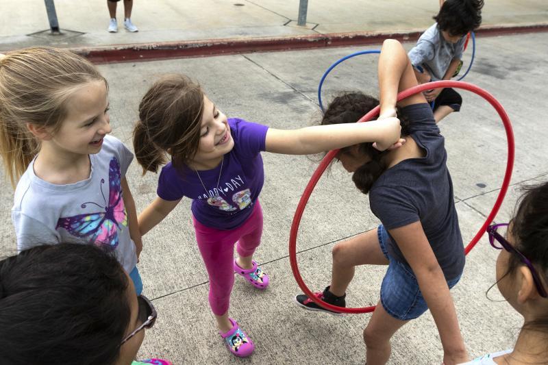 At the hula hoop station, Leann Henson, Teslee Lizotte and Alicianna Garcia try and pass a hula hoop around their circle without letting go of one another’s hands.