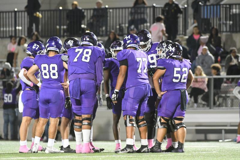 Above, San Marcos High School’s varsity football team huddles up during the 2022 season.