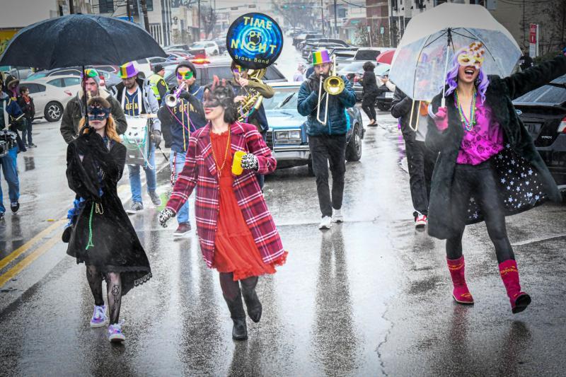 Above, the good times continued despite rain during the annual Mardi Gras Parade organized by the Mistick Krewe of Okeanos.