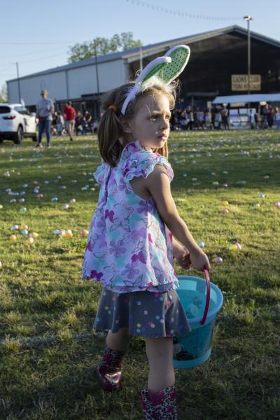 Excited to start collecting eggs, Bailey Goins gets in a sprinting position as she waits for the signal to start the Easter egg hunt.