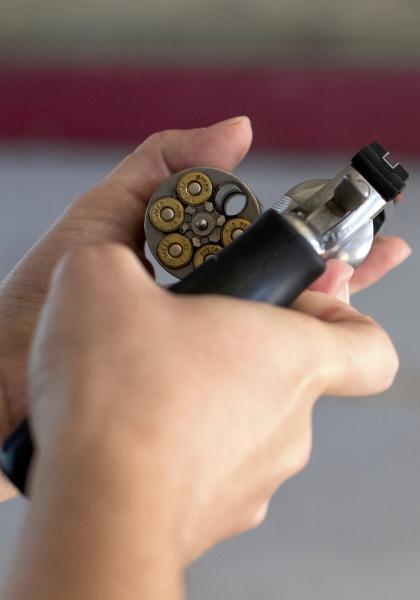 Cadet Alfonso S. Martinez reloads his Smith & Wesson .357 before the next round of shooting begins.