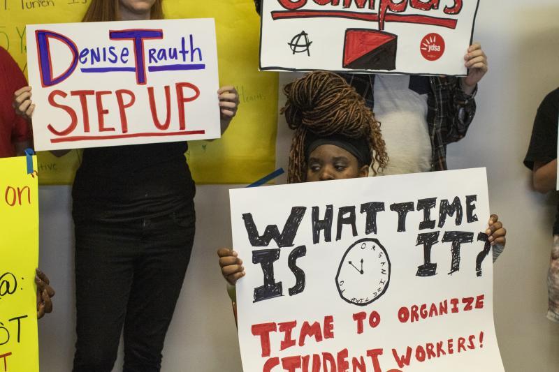 Kennadi Sneed holds aloft a sign advocating for student workers during the press conference.