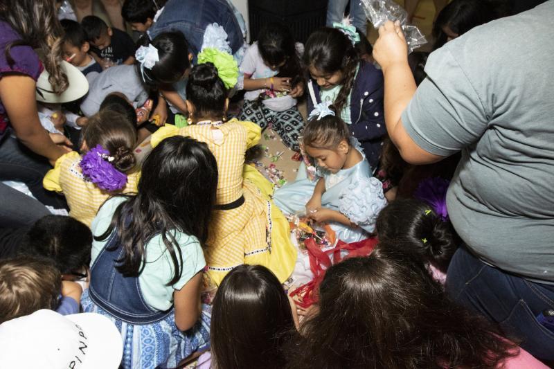 After busting open a piñata, children rush to collect candy at San Marcos High School.
