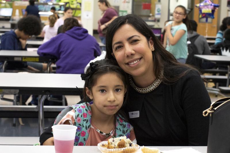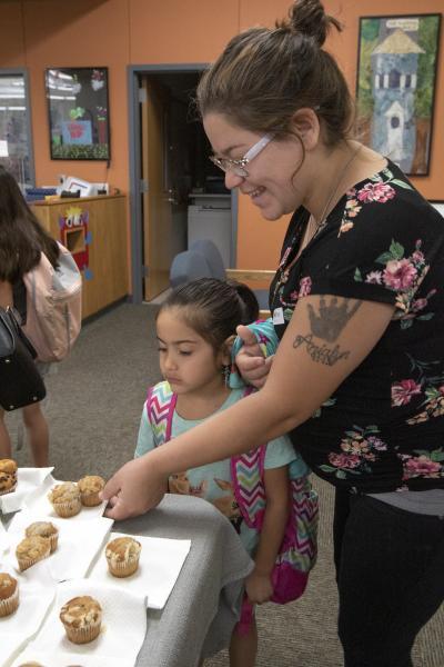 Kindergartner Ariana and her mother Francisca Alejandre look over the selection of muffin flavors.