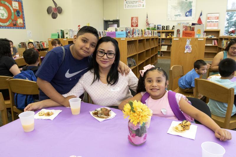 At their table in the library fourth-grader Enrique Sanchez, mother Edith and daughter first-grader Jackie pose together with their muffins and orange juice.