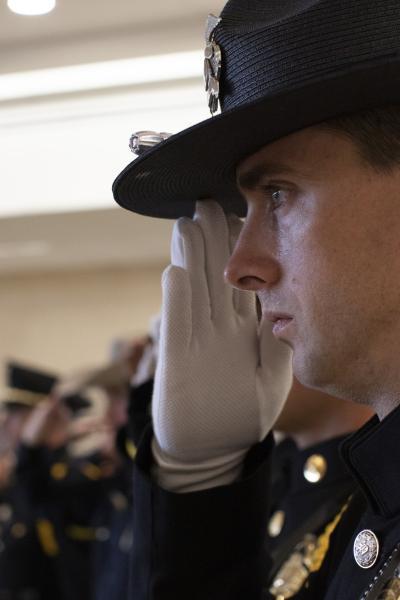 San Marcos Police Department patrol officer Daniel Duckworth salutes as a recording of taps is played.
