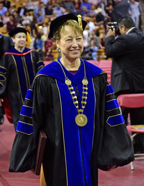 Texas State President Dr. Denise M. Trauth leads the procession into Strahan Area with a smile. In the conferring of degrees, Trauth stated the class of 2019 in the College of Fine Arts and Communications was the largest in school history.