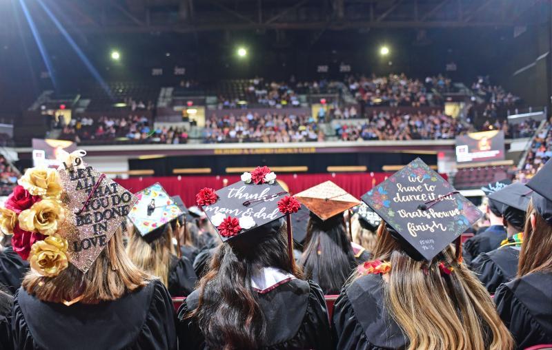 Texas State graduates display their mortarboards during Thursday’s commencement ceremony for the College of Fine Arts and Communications.