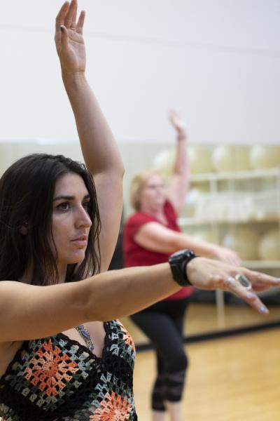 Student Katy Starr practices smoothing out her arm movements after learning the steps of the introductory bellydance routine.