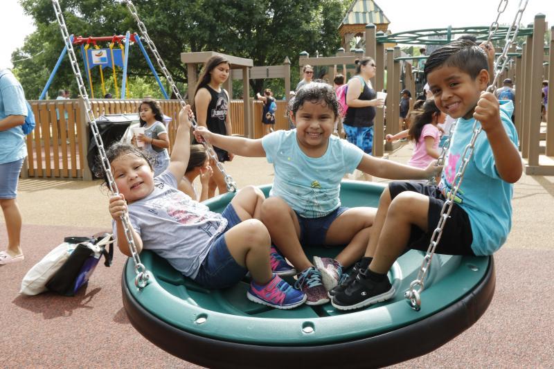 Sisters Emma and Elizabeth Bolanos and their cousin David Ledezma sport big grins as they are pushed in one of the group swings at Children's Park.