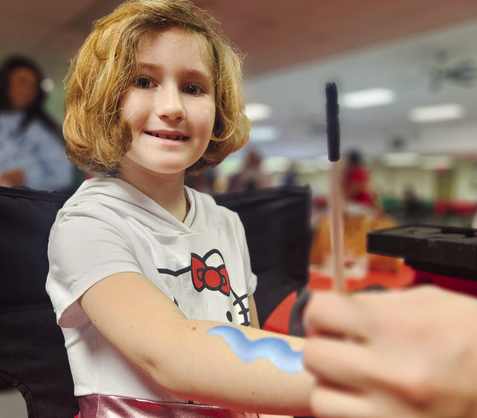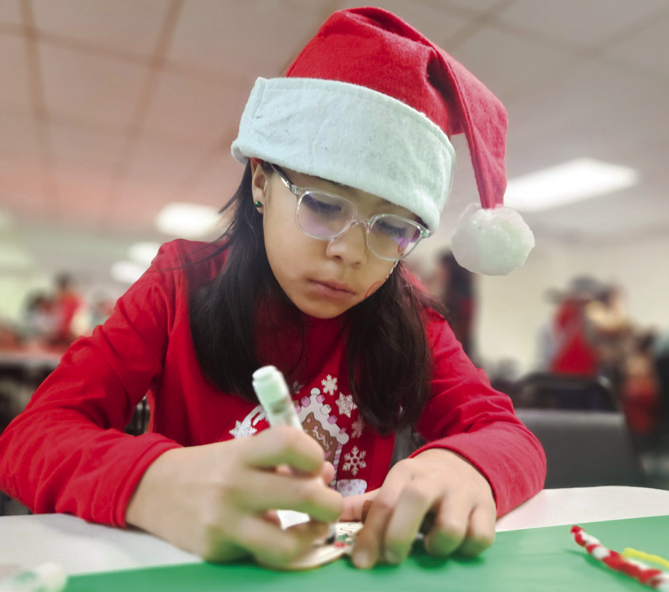 Above, Gianna Gil shows off her reindeer antlers with Santa. Below, Jackie enjoyed decorating cupcakes almost as much as she enjoyed eating them. Bottom left, most of the kids at the Cuauhtemoc Hall had their faces painted. Rhiannon Harrell chose a cool streak of paint on her arm. Bottom right, there were many stations for all sorts of crafts including Ari Matlock coloring in her Santa hat. Daily Record photos by Dalton Sweat