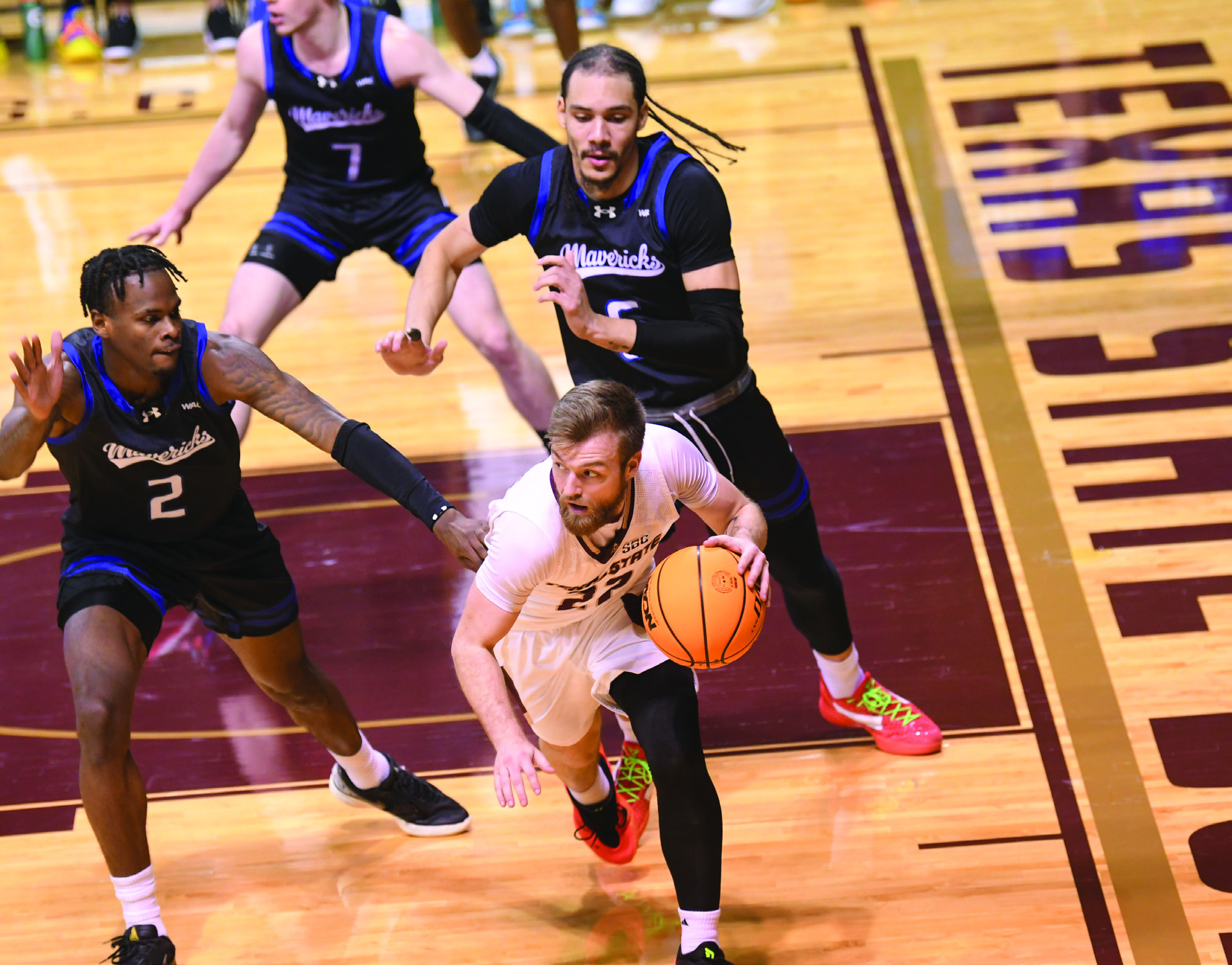 Texas State held a 39-27 lead with less than two minutes left in the first half, but a short 5-0 run by the Mavericks cut the lead to 39-32.