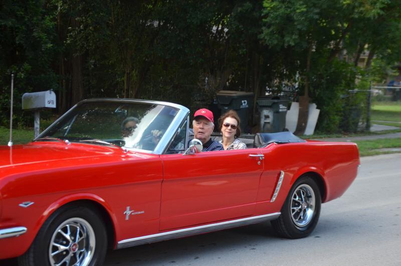 San Marcos Mayor Jane Hughson rides by in a red Ford Mustang during the annual Juneteenth Parade on Saturday.