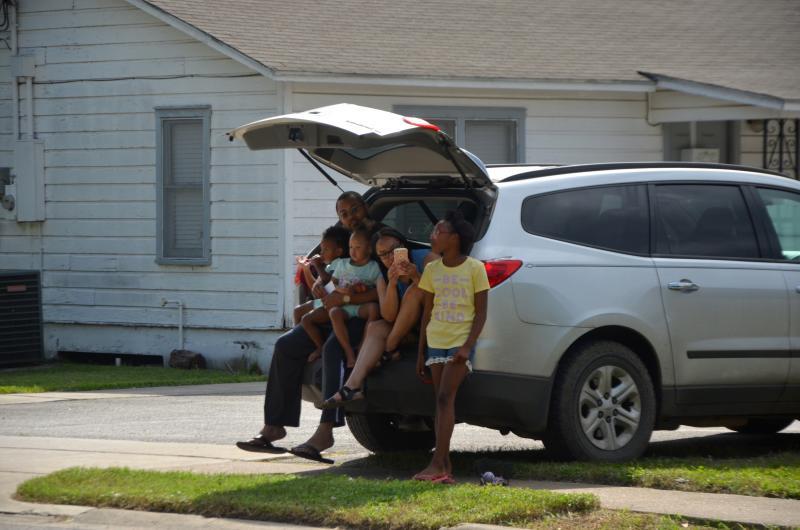 A family sits outside and watches as the parade as it goes up Martin Luther King Dr.