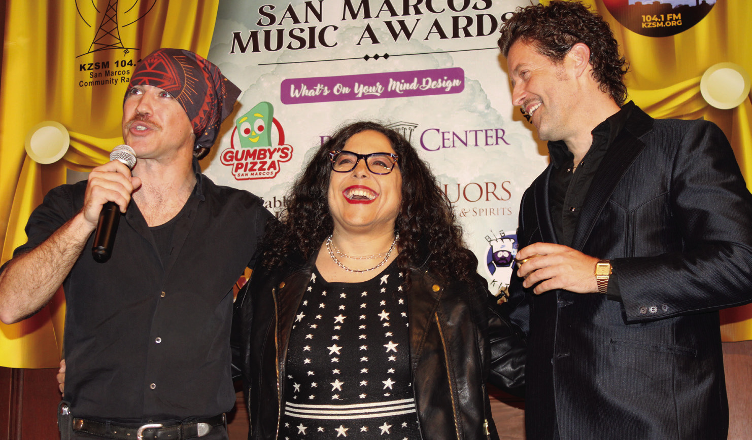 Above left, Chief and TheDoomsdayDevice, was the winner of several awards that night. Above center, some of the members of Loose Screws and Rusty Hearts after winning one of two awards that night. Above right, Rob Roark, aka “The Wiz,” a radio personality for KZSM and winner of Best Radio Personality. Below left, Will Riley gives the opening performance. Below right, Priscilla Leder presents Band Director Hector Ramirez with Best Classical for the San Marcos High School Jazz Band. Daily Record photos by Shannon West