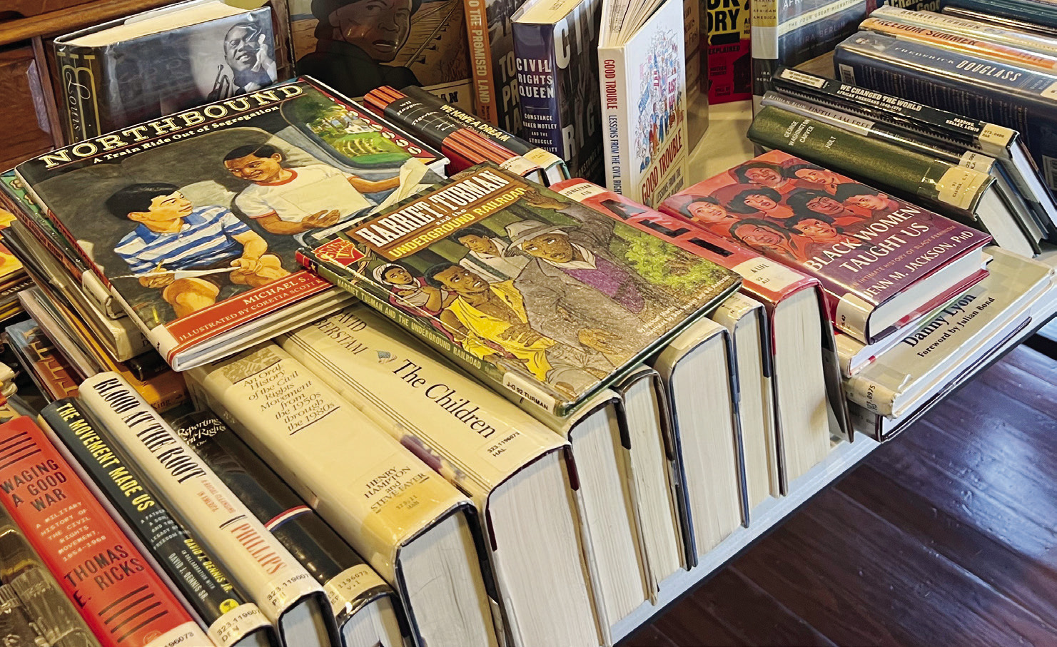 Above left, teachers that attended the event — Ms. Moon Hernandez, Ms Cruz, Ms Carol Fernandez and Ms Laing — along with their students. Above right, a collection of books brought to the event by the San Marcos Public Library. Photos courtesy of Calaboose African American History Museum