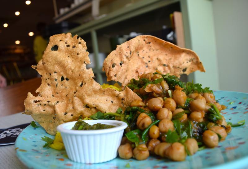 The Chana and Spinach plate at North Street features a traditional chickpea curry on coconut rice with crispy papadums on top and a side of green chutney.