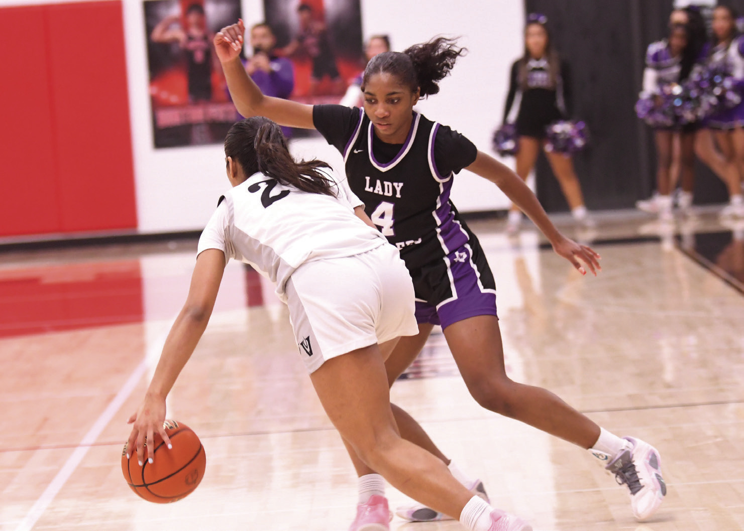 Above, Azariah Fennell defends the court during San Marcos’ win over Austin Vandergrift. The Lady Rattlers will play San Antonio Churchill this weekend with a date yet to be determined before the time of the press. Daily Record photo by Gerald Castillo