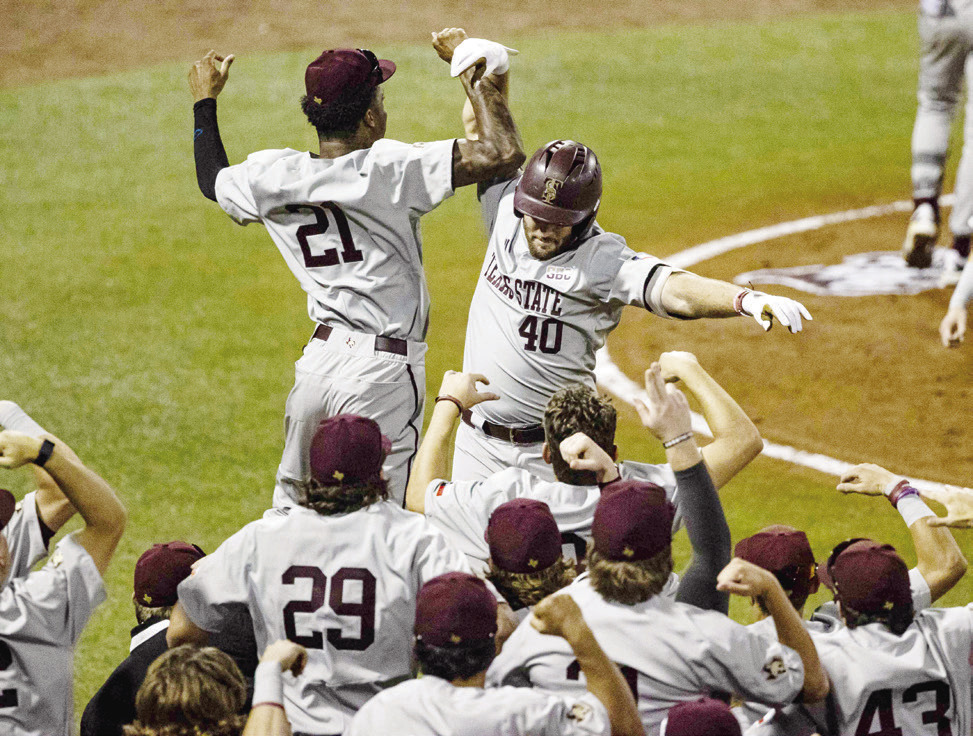 The Bobcats celebrate Austin Eaton’s home run in the bottom of the 3rd inning during Texas State’s win over No.1 Texas A&M. Photo submitted by TXST Atheletics