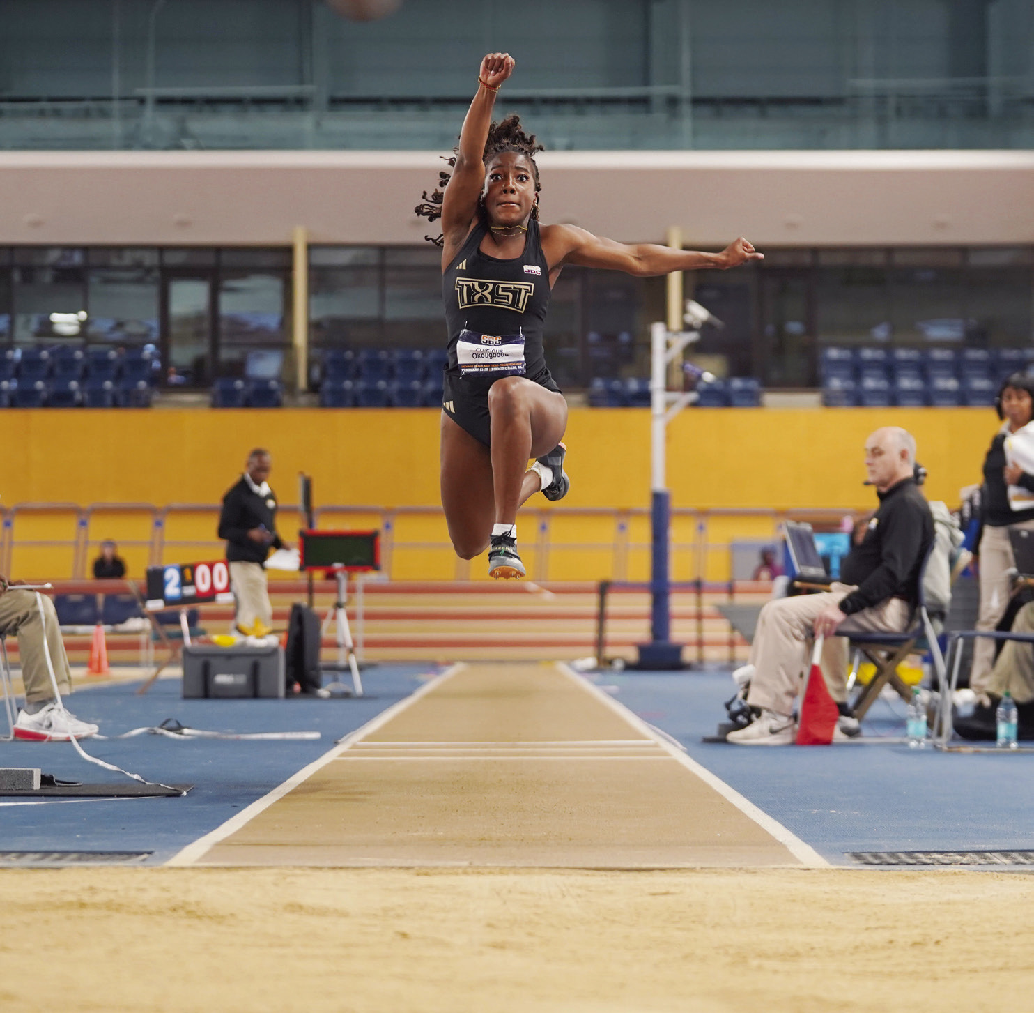 Top, Melanie Duron begins to throw the shotput. Duron took first place and will compete at nationals. Below, Precious Okougbodu jumps into the pit during the triple jump competition. Photo submitted by Texas State Athletics