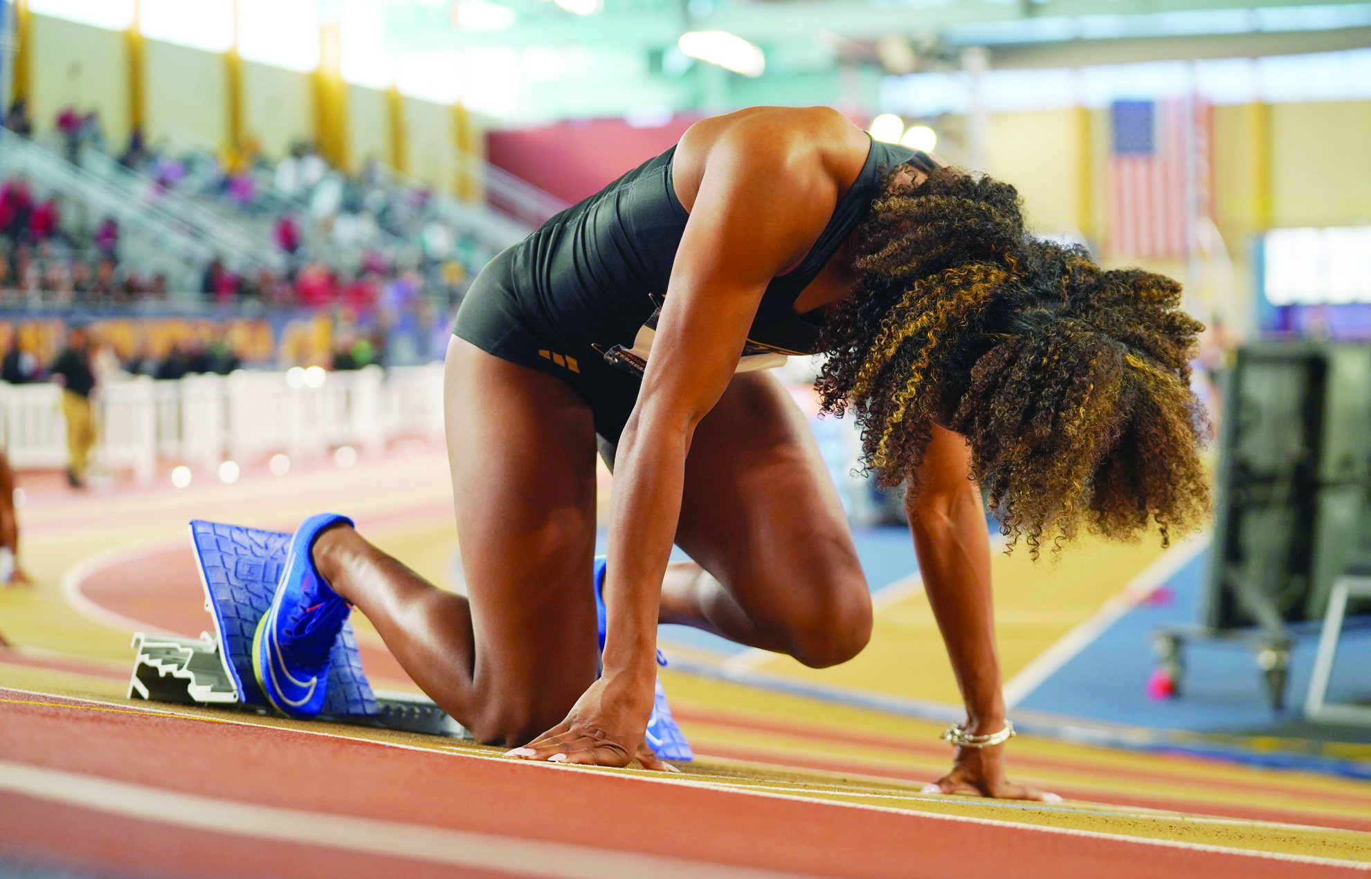 Junior Taejha Badal awaits the starting pistol during the Sun Belt Track and Field Indoor Championships. Badal won gold in the 200-meter run. Photo submitted by Texas State Athletics