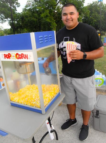 Jeremy Gonzalez serves up popcorn.