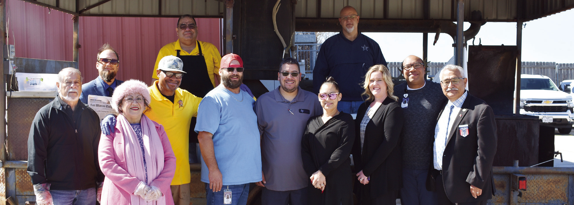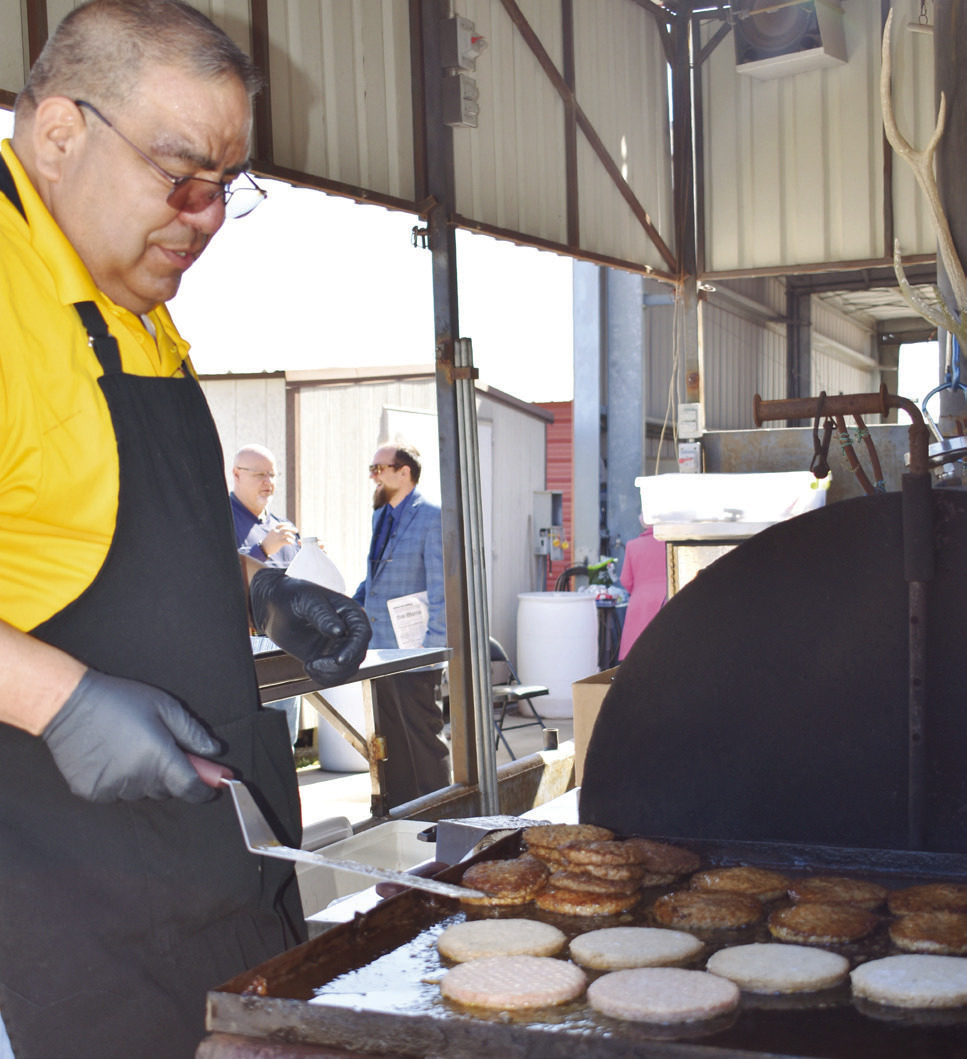 The Hays County Constable Pct. 1 Office held a Bus Drivers Appreciation event to honor those that get local children to school and back every day. Above, Hays County Constable Pct. 1 David Peterson (pictured in yellow) gives Dennis Jones (pictured in grey SMCISD shirt), SMCISD bus driver of eight years, the first burger for all his hard work. Left, Hays County Constable Pct. 1 Chief Deputy Mike Varela cooks up the patties. Below, Hays County Constable Office staff, SMCISD staff and other community members celebrating the hard work put in by SMCISD bus drivers. Daily Record photos by Shannon West