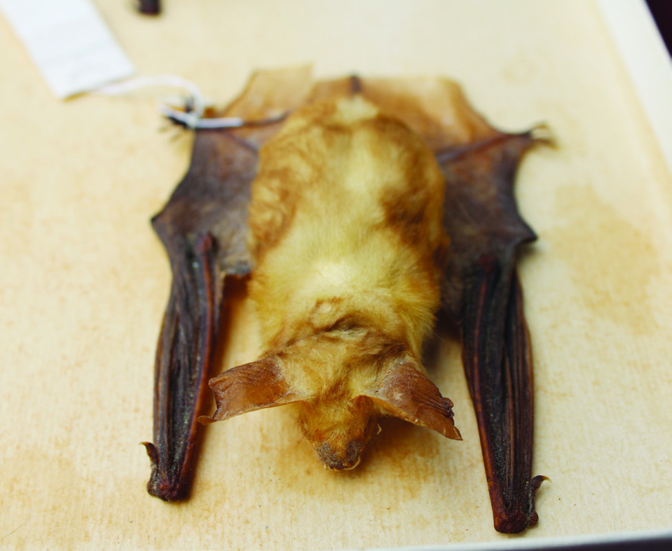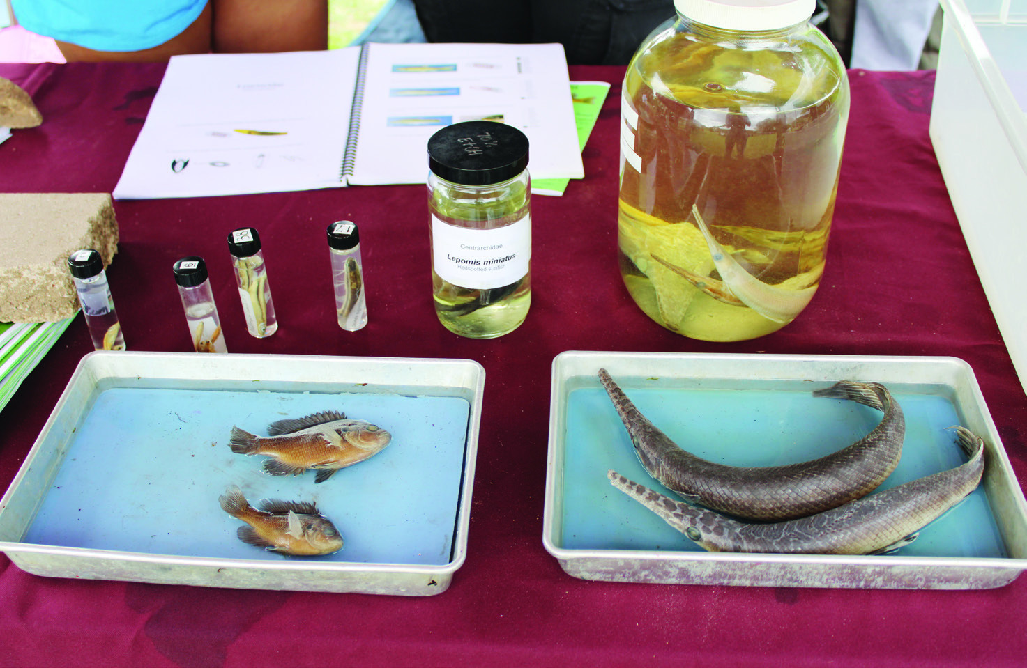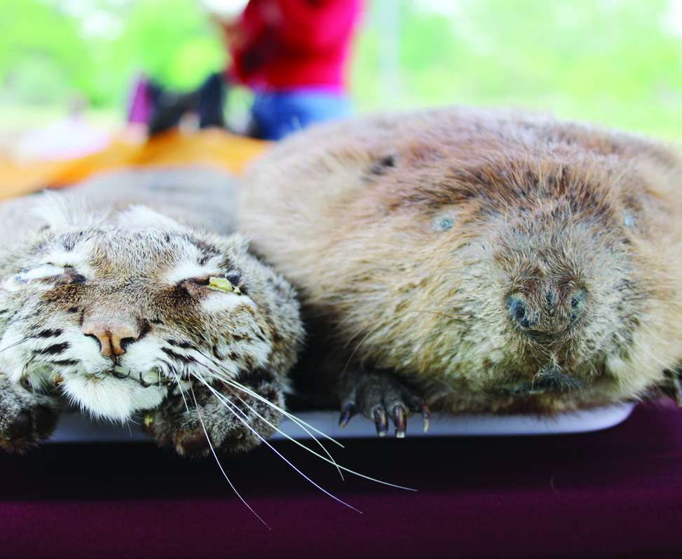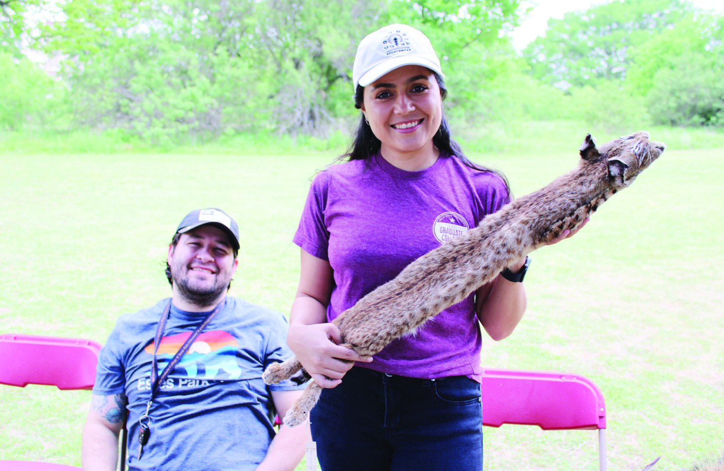 Above left, Texas State Biology Department was on site. Pictured are Andres Tamayo and Tatiana Velasquez with a taxidermied bobcat. Above right, TXST Aquatic Biology Department had a booth with preserved fish of various species. Below, Taxidermied animals at the Biology Department booth. Daily Record photos by Shannon West