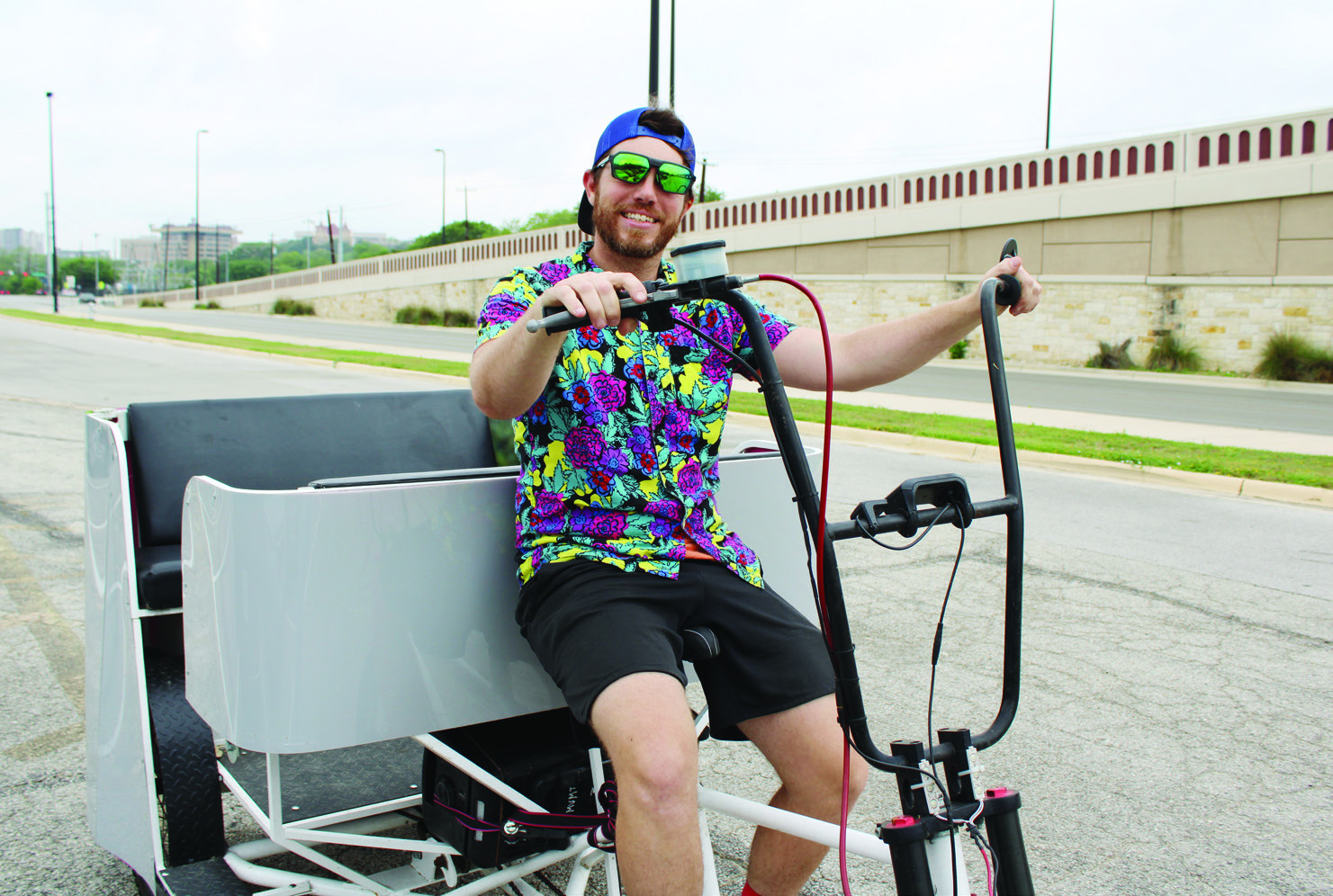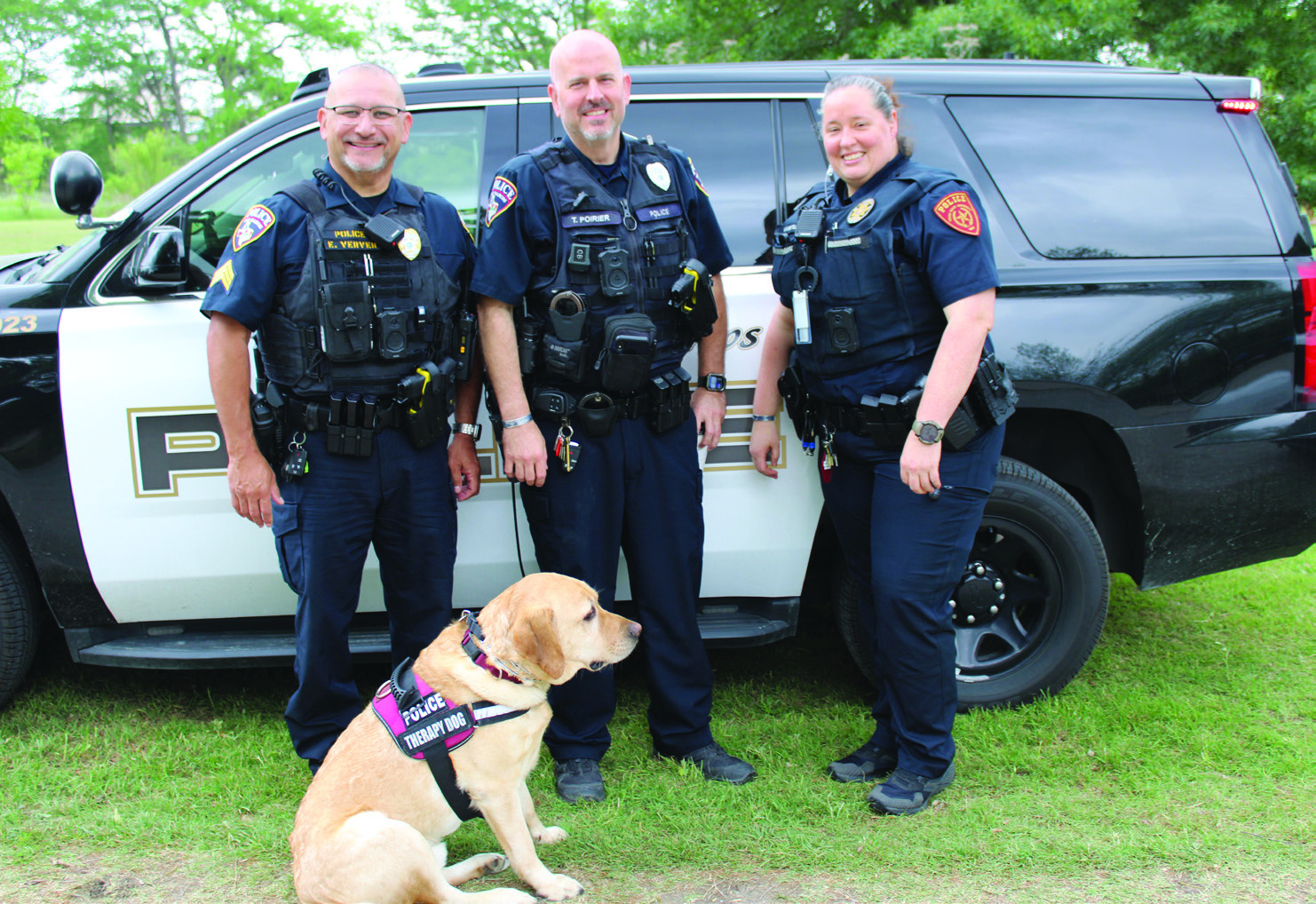Above left, Alex Pichot, as well as many others, was providing shuttle services from the parking lot to the headwaters. Above right, Ivy Hudson gets her face painted. Below left, Texas State University Police Department Officers Porver, Poirier, Marstellar and therapy dog Brady. Below right, Riley Lamas played a game at one of the booths. Daily Record photos by Shannon West